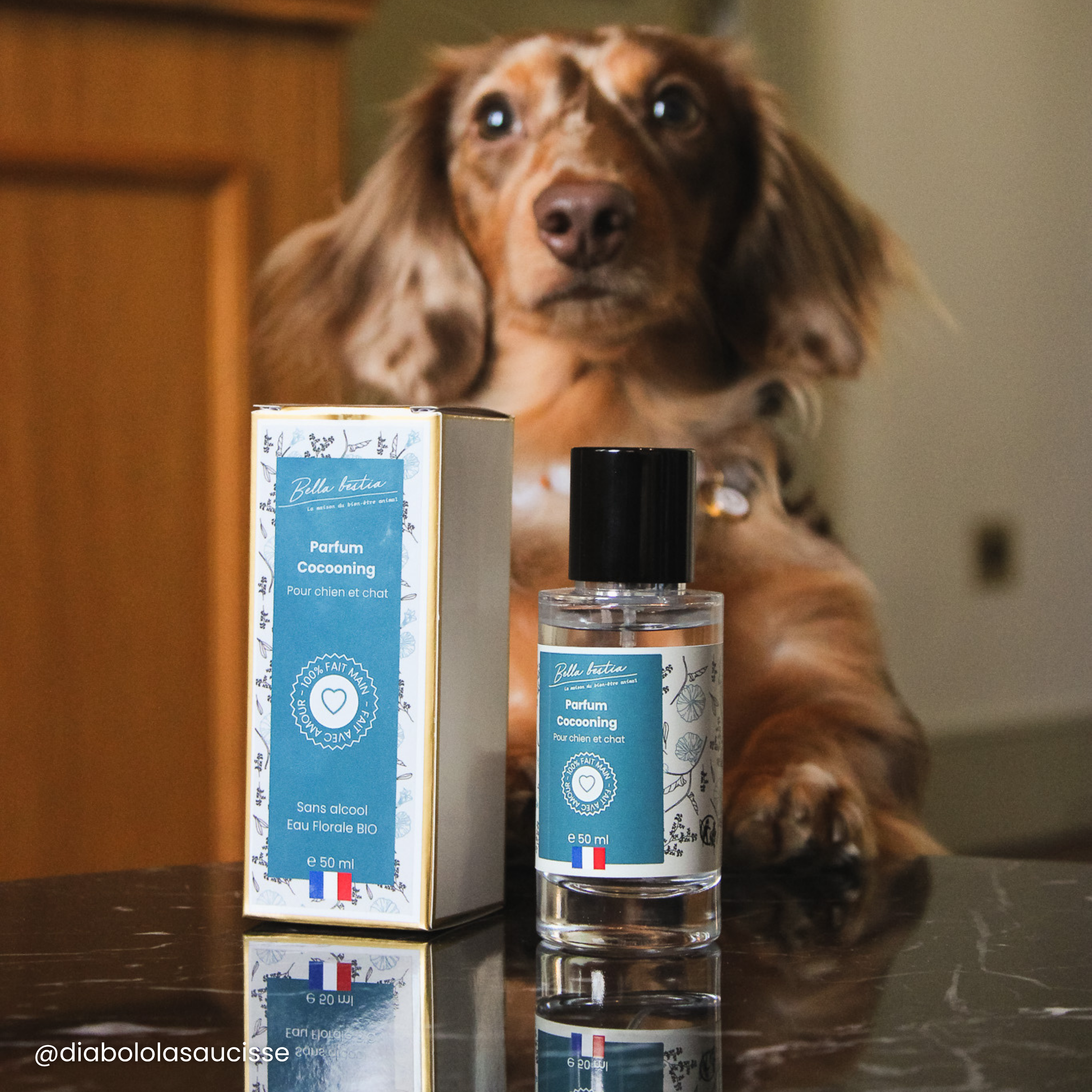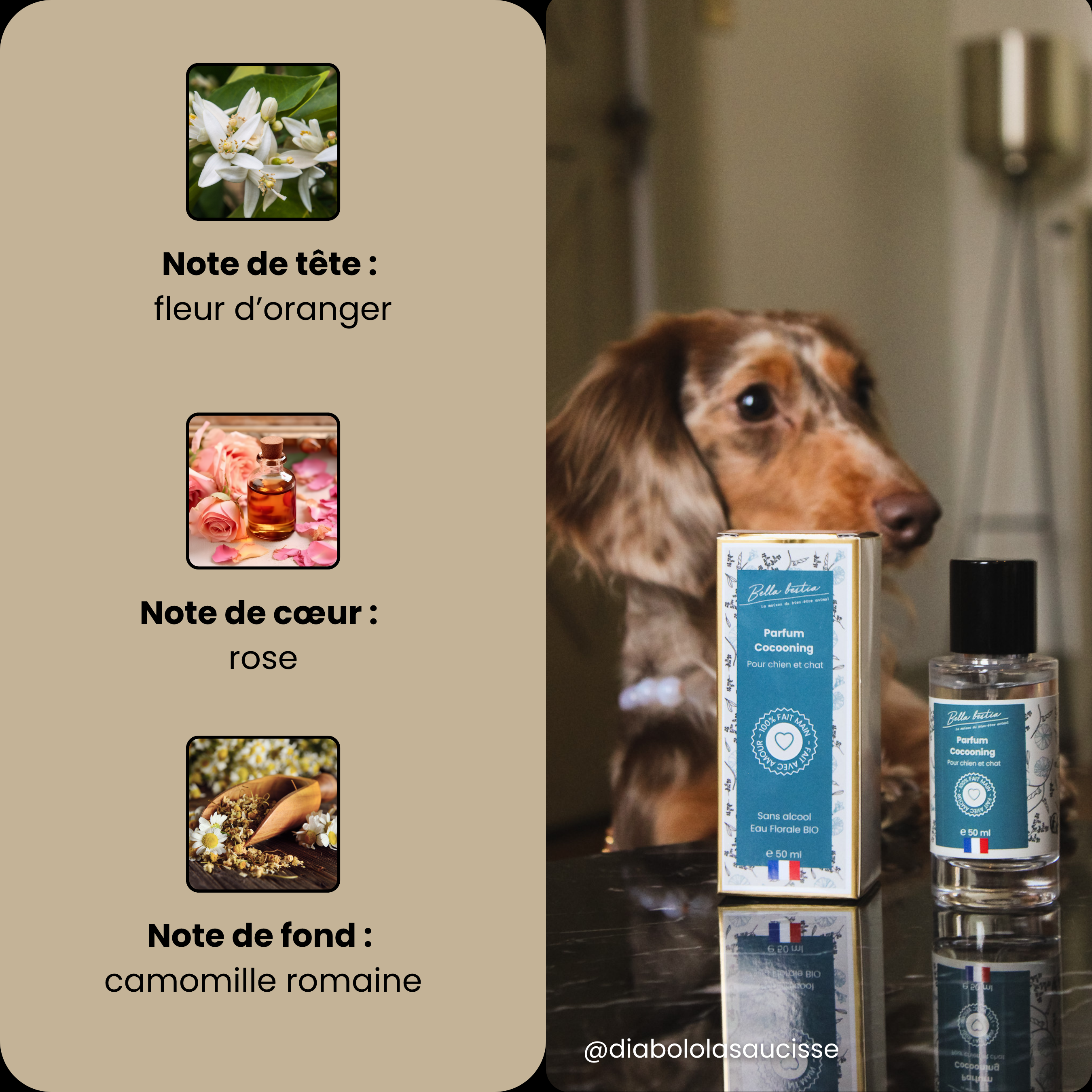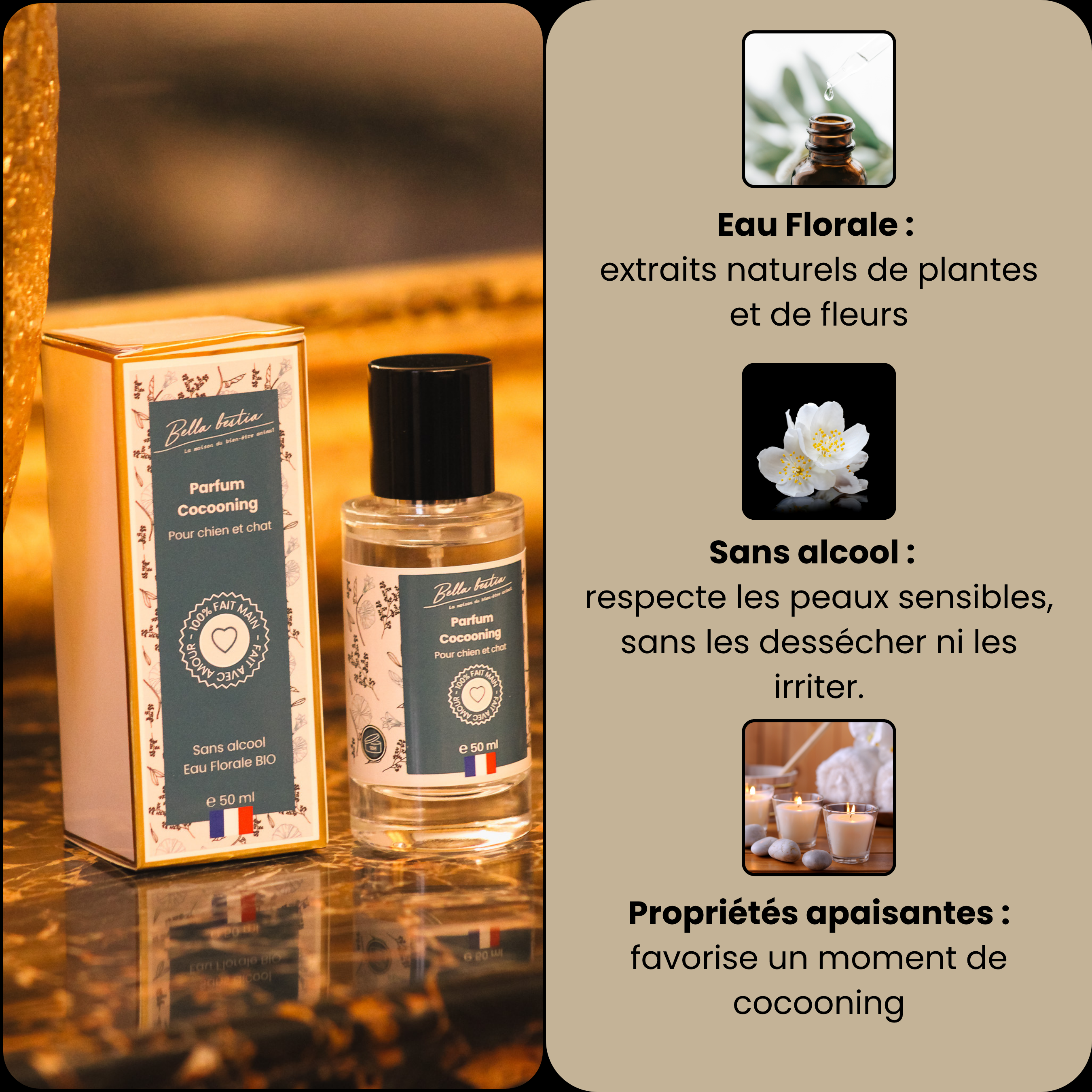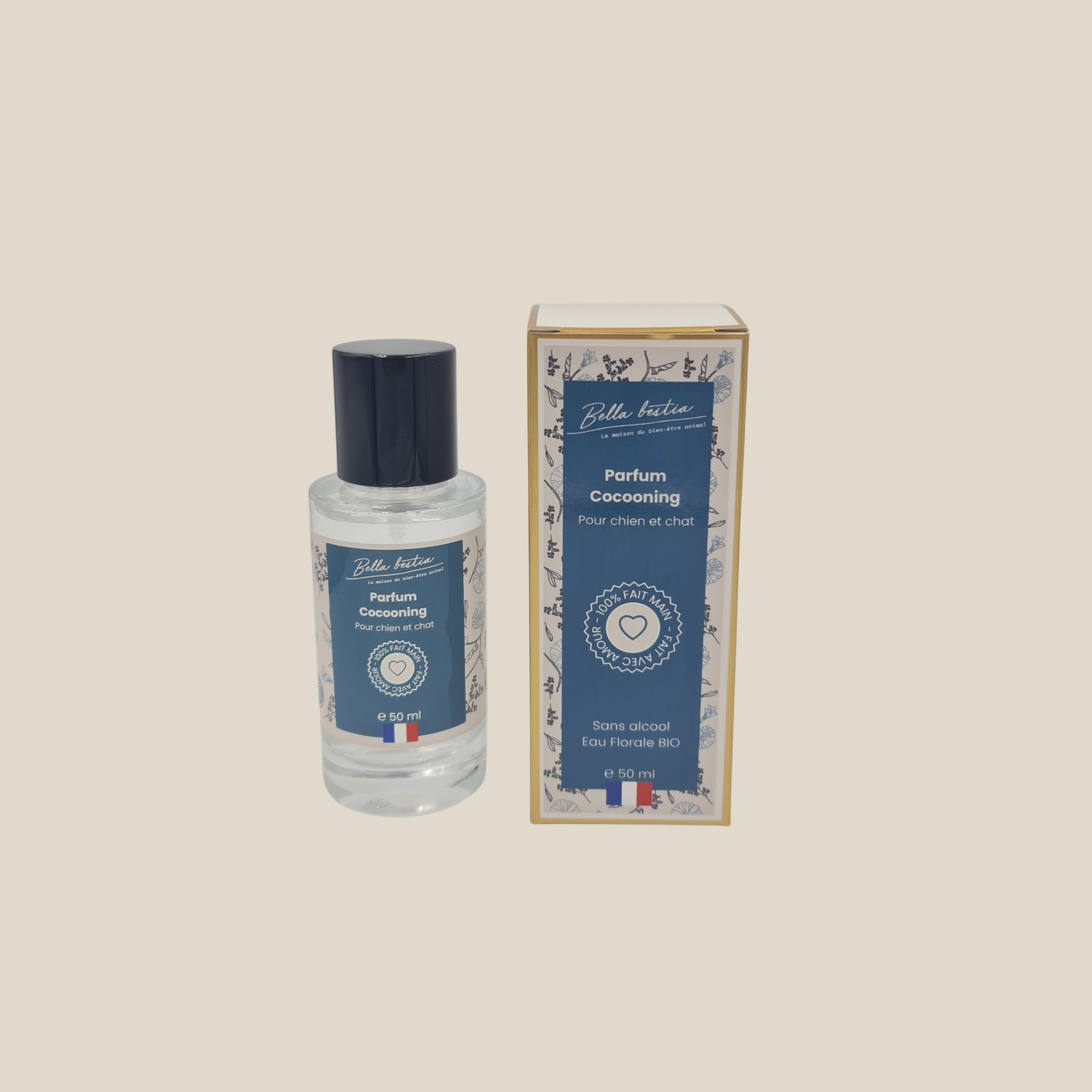 Formulé sans alcool, le parfum Cocooning est un parfum doux et respectueux, conçu exclusivement à partir d’eaux florales BIO. Sa composition naturelle et délicate apporte un moment de Cocooning à votre chien et/ou chat, tout en laissant une fragrance subtile et agréable. Idéal pour les animaux sensibles ou pour un usage quotidien.