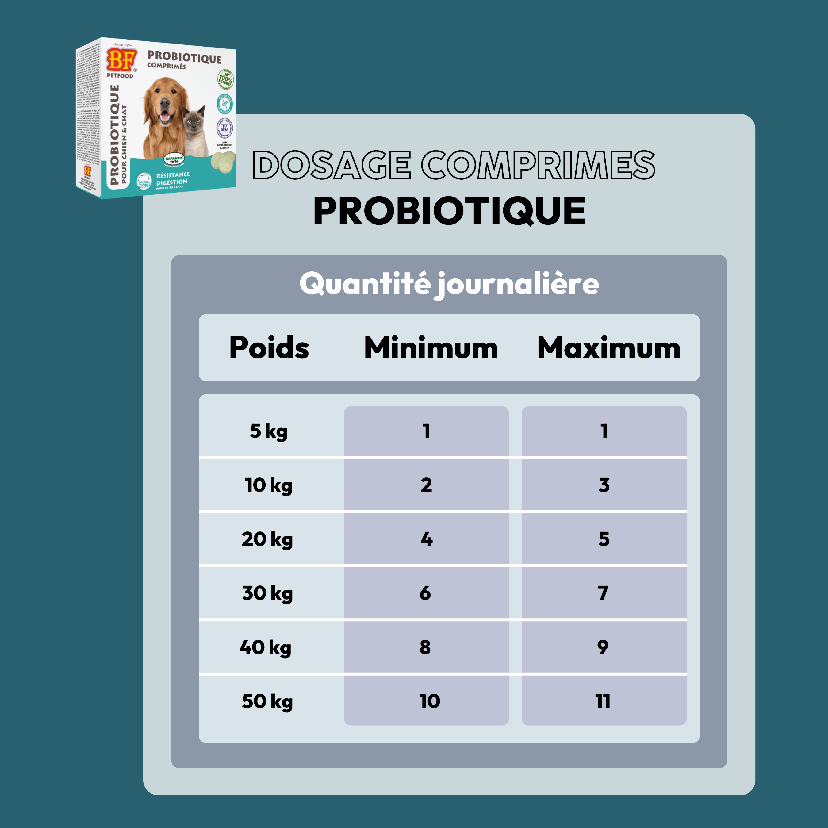 Chien / Chat : 1 comprimé par 5 kg de poids corporel et par jour.