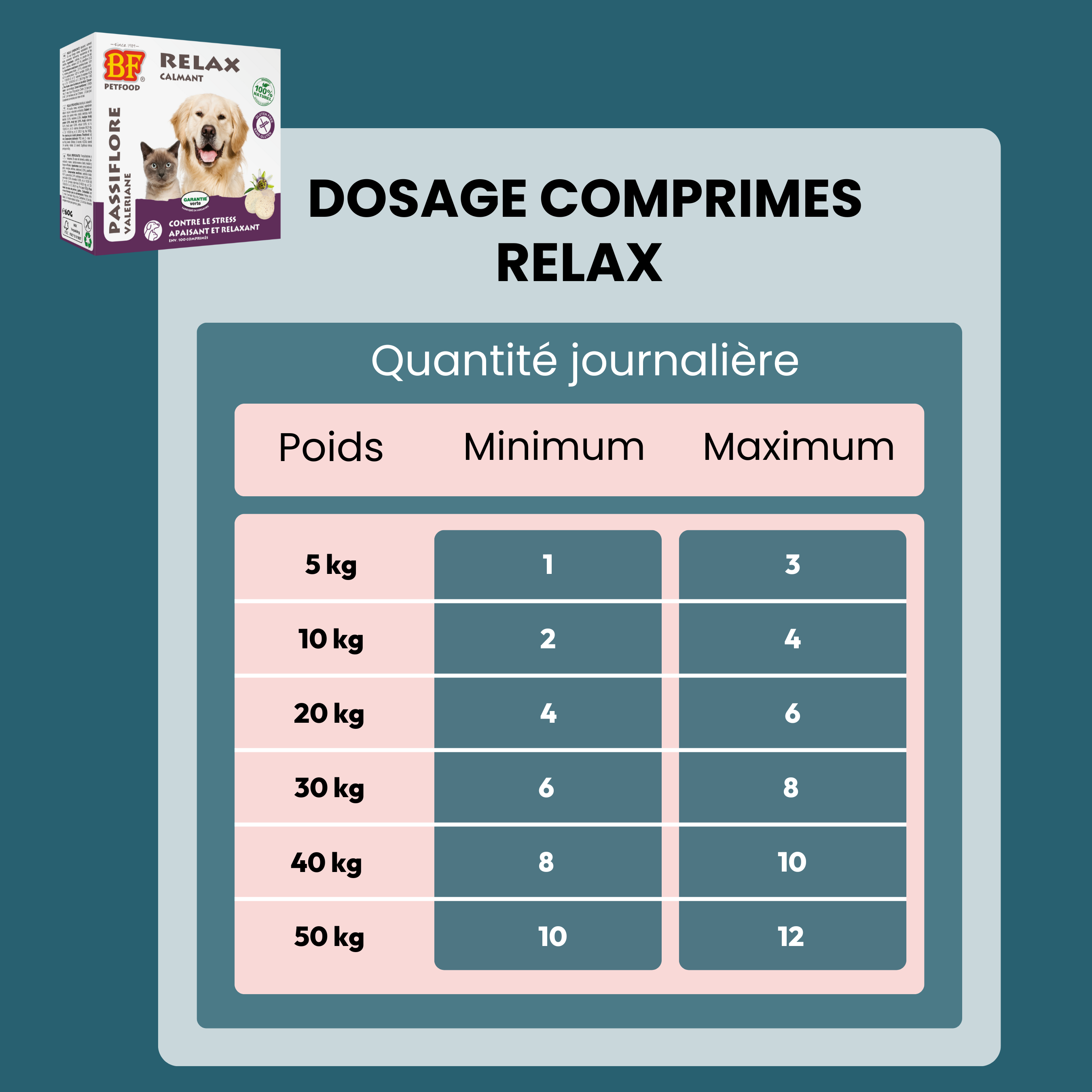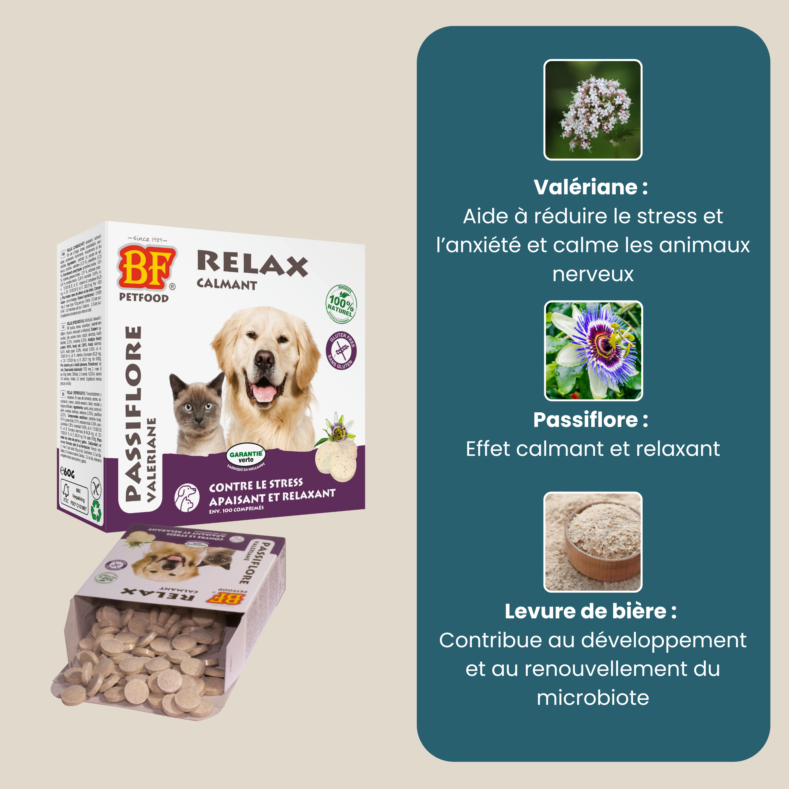 Comme tous les comprimés BF®Petfood, Relax est élaboré à partir de petit-lait (lactosérum), une source naturelle de probiotiques qui participe à une meilleure résistance de l’organisme. Le petit-lait est également riche en vitamines du groupe B, en minéraux essentiels (calcium, phosphore, potassium et magnésium) ainsi qu’en acides aminés à chaîne ramifiée, particulièrement bénéfiques pour le bon fonctionnement musculaire.